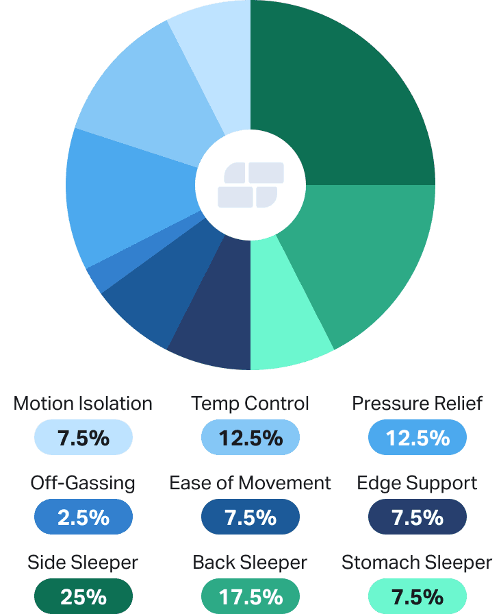 To determine a mattress’s overall score, we assign weighted percentages to performance categories based on how important they are to the individual sleep experience. For instance, areas like pressure relief and temperature control tend to matter more to people than something like off-gassing, and because more people sleep on their side and back than on their stomach, we weigh those positions more heavily.