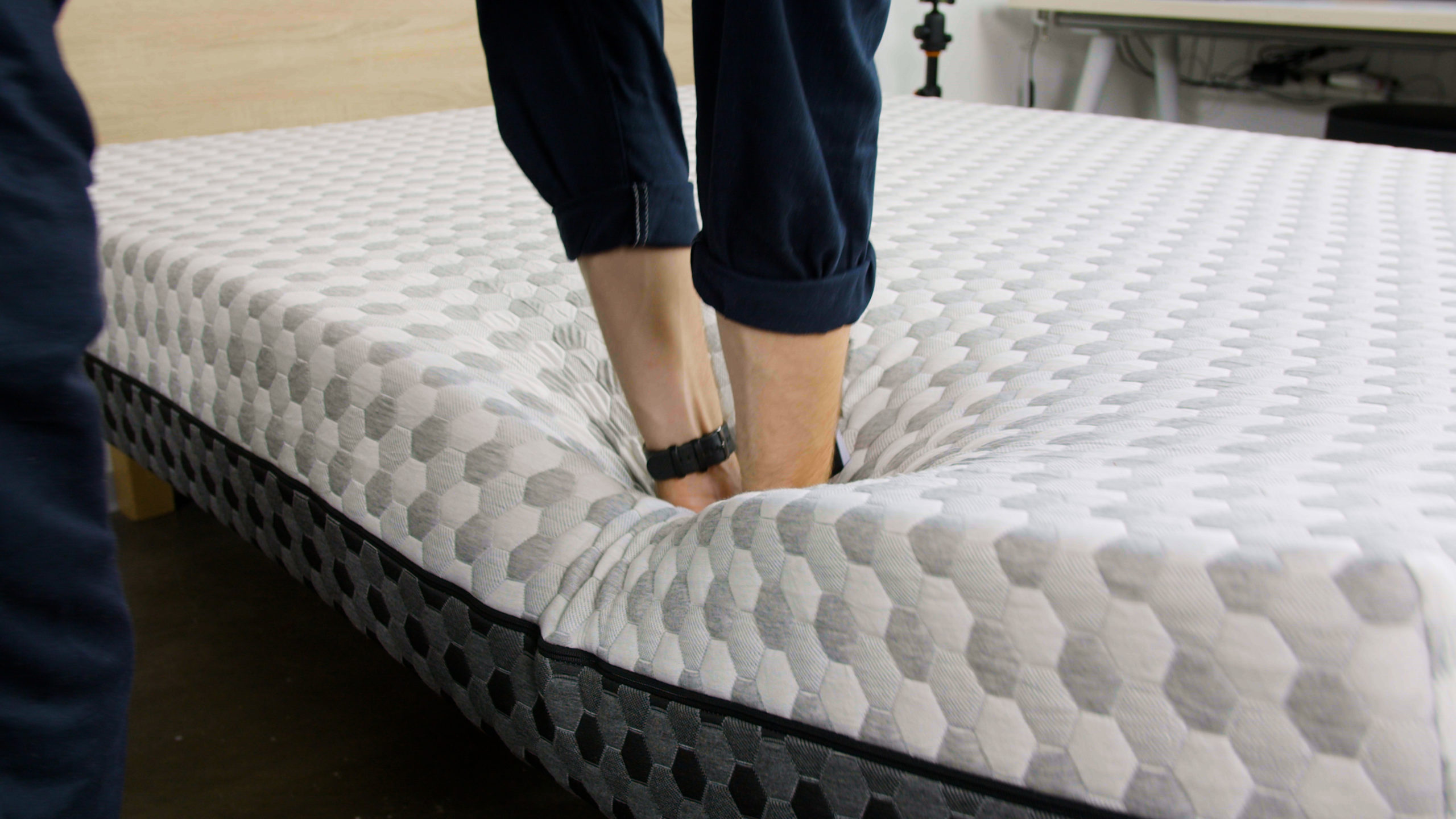 Many people like to sleep close to the edge of their bed or use it as a place to sit to get ready in the morning, so it’s important that a mattress can hold your weight and doesn’t collapse around the edges. To test for edge support, testers sit and lay around the perimeter of the bed to see if compression increases over time. Then we place weights around the edges and measure the distance that the edge compresses downwards.